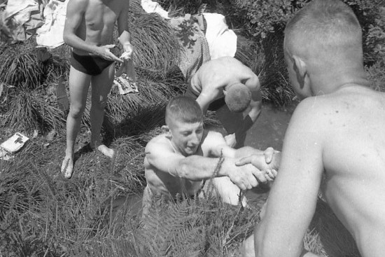 La GELINE prend sa source dans les marais entre les champs de tir du CAMP de GER et la zone de saut GER-BOIS d'AZET .Elle coule presque plein nord et longe le CAMP BATI sur ses limites Ouest .Elle infléchit un peu à l' Ouest pour se jeter dans le Canal d'UZERTE près de TALAZAC (65 )non loin du château de MONTANER Ce ruisseau bien connu des anciens du CAMP de GER fait depuis quelques années l'objet d'un ambitieux projet .L' étude environnementale de création d'un réservoir de 85 hectares pour un volume de 9Mm3 entre la D 168 et la D 27 est réalisée .Il ne reste plus qu'à entreprendre les travaux "Le cours de La GELINE est surligné .L'emplacement du futur réservoir est hachuré en bleu .Il est situé entre les localités de LAGARDE et PINTAC " "Tous les emplacements ne se valent pas ...certains bénéficient d'une sorte de mur des lavandières ...d'autres s' accomodent d'emplacements plus rustiques .Une tenue réduite au short EPM s'impose .Rappelons que dans le paquetage chaque parachutiste percevait un sac petite monture avec 1 brosse à habits , une brosse à cirage double face ,une brosse à graisse et une brosse à laver .C' est cette dernière qui est en action sous nos yeux .Un savon de Marseille était perçu toutes les quinzaines ..." cliquez sur la photo pour agrandir " Bien entendu cette opération lessive est aussi prétexte à se détendre .On observe que le parachutiste accroupi est chaussé des espadrilles à semelles de corde du paquetage .Le laçace à la mode Basque se fait autour de la cheville ." -" La lessive terminée il faut s'extraire du lit du ruisseau .tous sont en maillots de bain ..puisqu'il a bien fallu laver le short .Les maillots de bain du paquetage sont en laine kaki ou bleu marine ." "Il y a des lavandiers tout le long de la GELINE .Les treillis sont essorés par torsion Le linge est posé sur la végétation et sèche au soleil " " Il ne reste plus qu'à attendre que tout cela soit bien sec en se racontant des histoires ou en posant pour des photos souvenir " Cette grande lessive avait certainement lieu pendant le week-end lors de la formation de base ( les classes ) Il serait amusant de lire ce que les jeunes Appelés Volontaires Parachutistes écrivaient à leur famille !!! Les photos de ce témoignage sont dues au talent de Michel BERNATETS