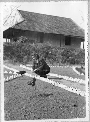 | Cette GEORGETTE était peut être une Assistante Sociale ...elle élevait une poule ..et semblait assez proche des paras .Ici réunis pour une ballade à velo les chasseurs Parachutistes DOGIE,VOIRY,CHIFFOLEAU,QUILICI,LUTRZ .Tous portent le chapeau de brousse avec des treillis US .Les bordures des pareterres faites en briques passées à la chaux sont typiques des cours de casernes ou de batiments administratifs aux "colonies | | | | |