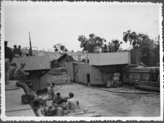 | Le L.C.T. 1329 ayant embarqué les Chasseurs Parachutistes va mettre le cap sur la RIVIERE CLAIRE .Ce L.C.T. a participé à une importante action de dégagement de TOURANE cette mème année 1947 .Comme pour tous les bateaux de débarquement la proue se présente sous la forme d' un hayon géant qui s' abaisse pour embarquer ou débarquer personnels et véhicules . | | |