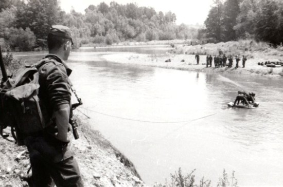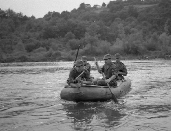 " NATATION .Le bassin n' a pu être identifié ...ce ne semble pas être à PAU " " BARRE FIXE ...Comme le grimper de corde les tractions à la barre fixe constituent un entrainement en vue des tests TAP Le gradé à gauche pourrait être le Sergent BERCKER " " BALLON MILITAIRE Ce sport collectif se pratique selon un mode dégradé des règles du rugby .Excepté l'imperatif de faire des passes à l' arrière et de poser le ballon dans la ligne de buts adverse , le ballon militaire ne connait aucune contrainte que celles imposées par l' arbitre ...nombre de joueurs , dimensions du terrain , tenue des joueurs ..etc , tout est libre .Les équipes en présence se différencient par le port du pull over pour certains alors que les autres sont torse nu ." " Dans le cas présent la partie se dispute avec un ballon de rugby ..on a vu des parties jouées avec un casque lourd ...Un des joueurs en pull over semble un peu mal en point Le point négatif du ballon militaire est qu'il occasionnait trop de blessures " " Empoignades pour la possession du ballon .Un principe le jeu au pied est exclu donc il n'y a pas de tentative de transformation ." " Bataille sur une ligne de buts pour marquer un essai .La partie se joue au Camp de GER sur un terrain de rugby sommairement aménagé " Les amateurs pourront revoir le témoignage PENTATHLETE sur ce même site pour gouter des photos de TIR,de COURSE , de NATATION,de PARCOURS du COMBATTANT et de LANCER de GRENADES . Au 1° R.C.P on pratiquait aussi différents sports dans les clubs régimentaires , sans oublier les sports de montagne , à l'occasion de séjours au CEM de BARREGES par exemple et bien entendu le saut en parachute . Toutes les photos de ce témoignage sont dues au talent de Michel BERNATETS .. ►FRANCHISSEMENT DE COUPURE HUMIDE (1963-1964 ) L' Armée de Terre à peine rentrée d' ALGERIE était en pleine réorganisation .Tous les efforts étaient concentrés sur le Corps de Bataille qui montait la garde à l' Est sur les deux rives du RHIN face à l' ennemi conventionnel . Cet ennemi ROUGE tapi derrière le rideau de Fer était réputé impatient d' envahir l' Ouest . Les Troupes Aéroportées auxquelles on faisait semble t il payer leur popularité acquise sur d' autres théâtres avaient quelque mal à se situer dans cette nouvelle donne ou il convenait avant tout d' être enfermé dans une caisse blindée un masque à gaz vissé sur le visage... Alors comme toute l' Infanterie non mécanisée ni protégée ...le 1° RCP s' entrainait au combat dit commando tout en maintenant son aptitude spécifique de spécialiste de la troisiéme dimension . Ainsi que nous l' avons déjà dit ( voir Les années PINATEL sur le site www.campidron.fr ) l' entrainement au franchissement était devenu une des activités favorites du Régiment . " A première vue le franchissement d'une coupure humide ne présente aucune difficulté pour le Parachutiste déterminé moralement et très entrainé physiquement Il ne faudrait cependant pas sous estimer l'importance de la distance à franchir " " En introduction à une séance de franchissement avec moyens de fortune - c' est à dire sans zodiacs - il faut apprendre à construire un radeau .En l'occurence un cadre en bois sur lequel seront fixés trois matelas pneumatiques ...Les matelas pneumatiques font partie du paquetage c' est donc la solution de facilité ...Cependant la mise à l' eau de l' esquif à l' armature très mobile pose quelques problèmes .En outre les matelas doivent ils être fixés sur ou sous le cadre ??? Notez les horribles casquettes de mecano dont sont encore affublés les Parachutistes ??? " " Reliés à la berge par un va et vient deux Parachutistes en équilibre instable , voguent vers l' autre rive en s' aidant d'une perche L' avantage du procédé est de permettre le franchissement en ne mouillant ni l' arme ni le passager Le Parachutiste vu de profil est équipé d'un poignard de type US 17 modifié " " Le matelas pneumatique n' étant que rarement disponible la construction de flotteurs avec la toile rigidifiée par une armature de fortune s'impose .Dans ce cas l' arme et le sac sont au sec, par contre le Parachutiste doit se mettre entièrement à l' eau ce qui pose problème pendant la saison hivernale en particulier" " Franchissement par radeau de matelas pneumatiques sous l' oeil d'un spectateur attentif qui attend son tour Il semble évaluer son pourcentage de chances à gagner l' autre rive sans tomber à l' eau. Pour ne pas être gêné dans ses mouvements il a planté sa pelle US dans son sac à dos " " Deux binômes dirigent leur embarcation à base de toiles de tente vers l'autre rive Comme ils paraissent avoir pied qui plus est dans une zone sans courant ,l'opération est relativement aisée. Au milieu du gave un nageur utilise un matelas pneumatique comme une planche dans une piscine Il ne transporte rien ??? Peut être joue t il un rôle de sécurité en étant pret à assister un camarade qui tomberait à l' eau "