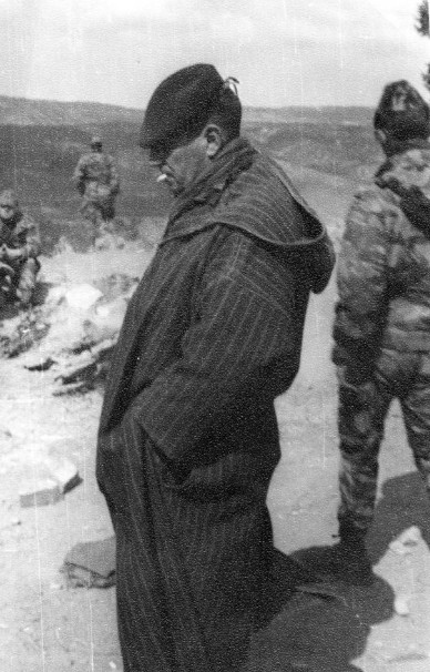 " A son PC Ops le colonel PLASSARD a revêtu la djellabah locale pour se protéger du froid .L' idée du Putsch n' est probablement pas encore concrètement dans l' air ....a quoi peut bien penser le Chef de Corps du 1° RCP ? "