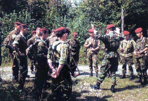 " Le Capitaine VASSEUR procède à une séance d'instruction des cadres. Les jeunes vétérans des djebels après avoir FAIT la GUERRE apprennent comment on doit la faire !!!.Comme disait - parait il - le Général BIGEARD :il y a la Guerre et l' école de guerre !! C' est la période ou émergea un type d'Officier de temps de paix qui pour satisfaire au politiquement correct du moment inventa une sorte de pédagogie verbeuse sensée contribuer à l' émergence d'une armée dite moderne .En caricaturant on pourrait dire " dont les soldats étaient soudainement devenus intelligents par le progrès du modernisme et les cadres demeurés dans je ne sais quel obscurantisme " Peu à peu les critères essentiellement scolaires l' emportérent sur l' aptitude guerrière .