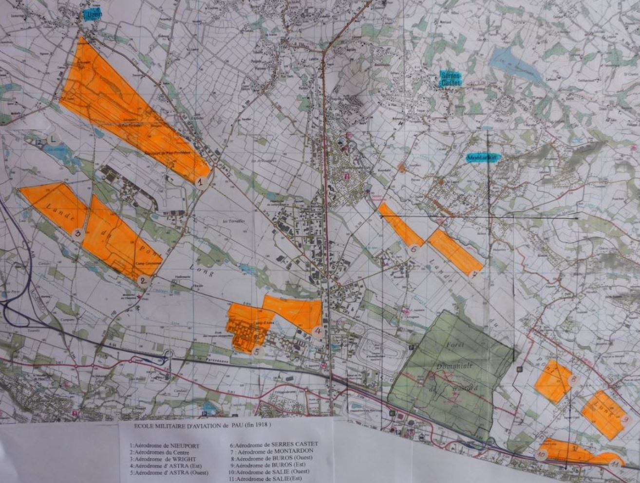 Marquée en orange fluo l'implantation des anciens aérodromes est concentrée au nord de PAU sur les terres de La LANDE de PONT LONG de part et d' autre de l' axe Sud-Nord que constitue la D.834 / N./134 .
