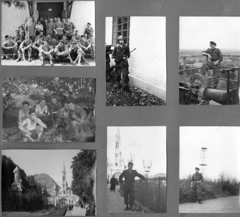 " En haut photo de la Section devant un chalet du Camp d' IDRON ou elle est logée .En dessous ,lors d'une "sortie terrain " pause sous les ombrages de châtaigner .Il y avait beaucoup de ces arbres aux alentours des Camp d' IDRON et de GER .En bas deux photos d'une visite touristique à LOURDES .André BERNARD en tenue de sortie modèle 1946 n' est pas encore breveté "