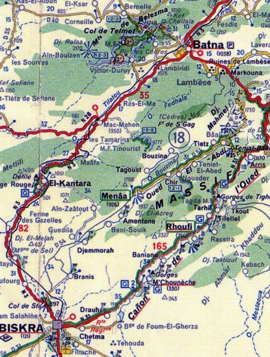 " Cet extrait de carte permet de situer au Nord BATNA , au Sud BISKRA à son Est AÏN NAGA ,au centre et aux lisières Sud de l' AURES DJEMINA et TADJMOUT ."