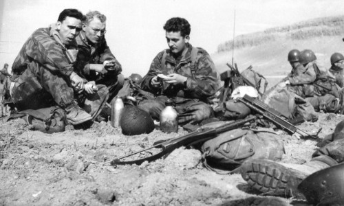 " Les caisses de rations sont livrées par" banane " On voit à la coupe de cheveux que l'unité n' est pas rentrée en Base Arrière depuis quelques temps .Casse croute sur le terrain .André BERNARD est à nouveau très proche du poste radio SCR 300 , à coté de lui deux sous-officiers , sergent-chef ou adjudant Etienne MANFREDY et Robert ABEILHE ( blond à lunettes ) de la CCS spécialiste trans .Comme il est armé d' un fusil il ne peut être radio ( armé d'un PA ) mais pourrait par contre être conducteur de la jeep du Capitaine ...de la C.P. par exemple ."