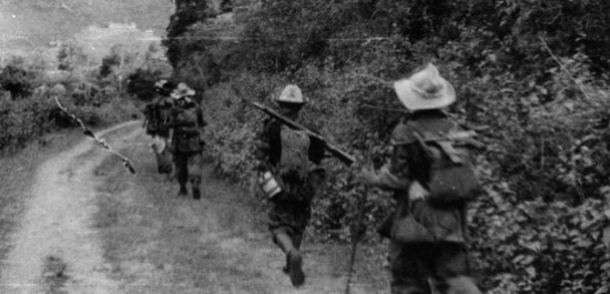 " Cet homme dont on ne distingue que la silouhette porte son Fusil Mitrailleur (24/29 )sur l' épaule Dans une pareille végétation qui impose des combats de rencontre à très courte distance le Fusil Mitrailleur est réduit au role d' arme individuelle défensive "