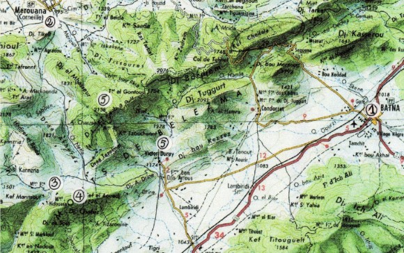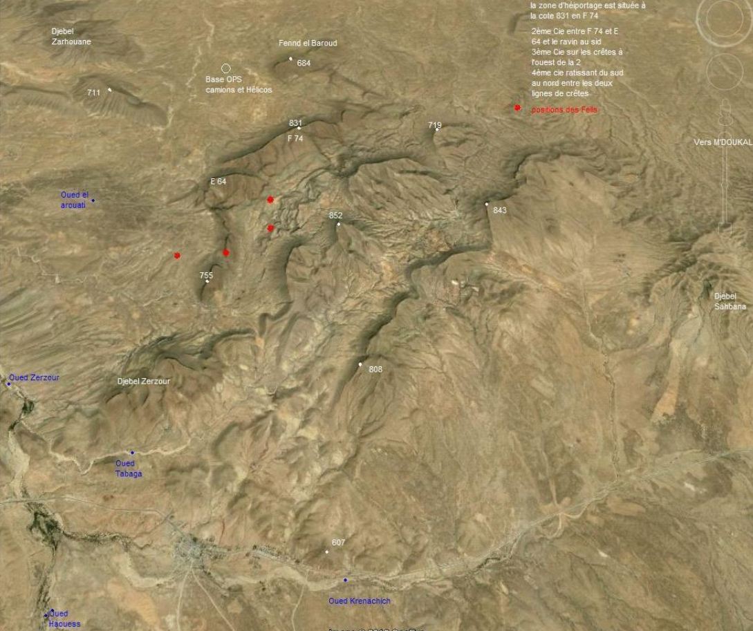 Départ de BATNA (pastille 1° ) une grosse katiba repèrée à MECHTA HIDOUSSA (pastille 2°) près de VICTOR DURUY (pastille 3° ) accrochage sur le DJEBEL CHAFFEZ ( pastille 4° ) nouvel engagement vers le DJEBEL TICHAOU cote 2138 (pastille 5° ) Au Nord CORNEILLE ( MEROUANA ) (pastille 6° | |