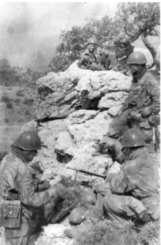 " La bas cela grenouille mais une végétation extrêmement touffue cache l' adversaire.L' artillerie et les appuis feux aériens embrasent le djebel "