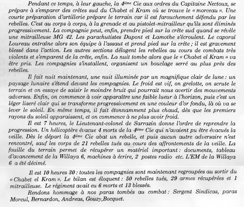 Monsieur Guy PIERSON nous apporte les précisions suivantes "J' ai servi au 18° R.C.P. de 1958 à 1961.J' ai participé aux combats des 21 et 22 avril 1959 (ECH CHEGAIG) J' étais à la 4° Compagnie -Carmin- du Capitaine NECTOU .