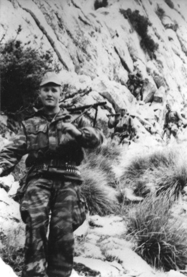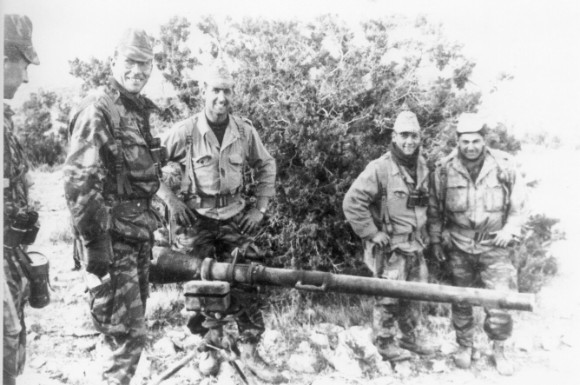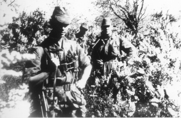 Le Sergent chef DEALBERTO - dit la chouette -revètu d'une veste de fabrication Anglaise dite "peau de soc.. à gauche : " 26 Novembre au 6 Décembre 1960 Opération CHARENTE Le 18° RCP installe de nouveaux bivouacs dans les AURES Les Sergents de la 3° compagnie : RENOT (x) PERRIER,NEDELLEC (x) Accroupis : CHARRIER ,DARRIBERE,PONCELET " à droite : "Section de Commandement de la 1° compagnie La satisfaction se lit sur les visages à la suite de l'interception des rebelles qui tentaient de fuir .Adjudant BRETON,(x) KOEPPEL ( titeur canon de 57 SR ) TROMPETTE .A leurs pieds le canon de 57 SR