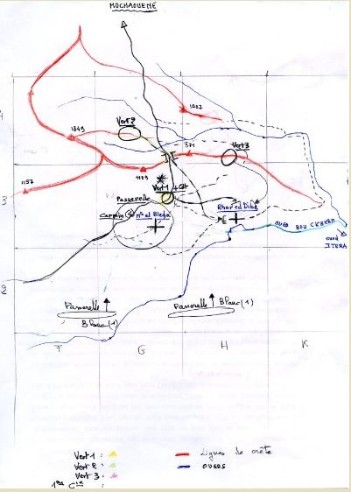 Cliquez sur la carte pour l'agrandir "La CA a quitté le KEF SIDI MAROUF ( environ 5 kilomètres du bord Est de l' extrait de carte ) pour s'installer à la MECHTA BOU ETANE (pastille bleue ) .La CA sera chargée de RHAT ED DIBA la 4° Compagnie de EL BLEDA ( pastilles rouges ) "