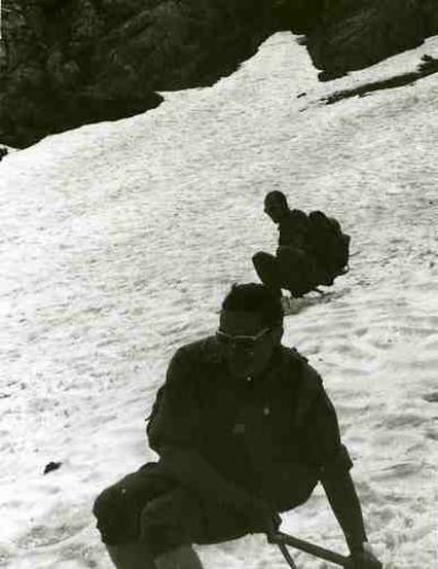 - DÉCEMBRE - Le premier saut de manœuvre compagnie . En décembre nous devons effectuer le premier saut , compagnie groupée , hors du contexte sécurisant de l' E.T.A.P. Psychologiquement c'est un passage très sensible , son bon déroulement est déterminant pour l' avenir . Il s' agit d' un saut, dit de manœuvre, sur zone extérieure .Les parachutistes outre leur musette toujours trop chargée, sont porteurs de leurs gaines d' arme , de transmission, de leurs outils individuels .....Levé à quatre heures du matin ,glacé par un froid vif , n'ayant dans le ventre qu' un bol de café noir le para s' équipe, les moniteurs le secouent ,le manipulent sans ménagement . Dans sa tête les séquences à venir se bousculent : la sortie ,la descente sous voile ,le largage des gaines , la réception au sol , le regroupement .....Le corps cassé en deux sous le poids de la charge c'est l'embarquement . Dans l' avion les visages sont tendus ,les gradés donnent les dernières consignes dans le vacarme des moteurs. SONNERIE !!!! VERT !!!!!A une cadence que contrôlent tout juste les largueurs , les cadres répartis sur les câbles donnant le tempo par les deux portes , les avions de la compagnie sont évacués en un rush impressionnant qui voit les derniers de passages franchir la porte au pas de gymnastique . Aucune défection!! Formation initiale terminée, la 3° reprend sa place dans l'ordre de bataille des Compagnies de Combat .Ces jeunes, à leur tour, ont fait leur notre devise JE VEUX JE PEUX .  - Il est ouvert ! ! ! Le paysage est grandiose ! ! ! Quelques secondes de bonheur indescriptible ! ! ! - - A peine posé la séquence combat reprend la priorité........ - NOËL approche : , la perspective du départ en permission de longue durée ( P.L.D. ) pour l'une des deux fêtes donne du courage aux Noirs qui sont confrontés pour la première fois aux exigences du tour de " Compagnie de Grande Semaine " . Le déroulement de ce type de semaine n'est guère prisé de nos Parachutistes . Il y a la garde au Camp d'Idron pleine d'embûches , à commencer par la présentation matinale au Colonel, et puis toutes les servitudes, dans tous les coins du Camp. Nettoyage à la C.D.O. ( service de restauration ) , nettoyage du foyer , rangements divers au MATI ( magasin d'habillement et du commissariat ) , mise à disposition du S.G. ( Service Général ) pour toutes taches d'intérêts collectif, entretien du Champ de Tir........en gros des tas d'activités peu gratifiantes dont nos Paras se passeraient bien volontiers. L 'Apprentissage de la vie en collectivité, le Para Avignon et ses copains de chambre à Noir 1 . Moment de détente. Avant la réintégration pour le départ en permission , nettoyage et revue d'Armes par le Sergent Kestler de Noir 1. - La météo est au rendez-vous ..... comme pour donner le signal du départ en permission de Noël. - - JANVIER - Début janvier toute la Compagnie est à Idron. A leur retour de permission les Parachutistes ont appris par le tableau de présentation des activités, à l'entrée hall du P.C. de Compagnie , que le départ pour Barèges était imminent. BARÈGES : voisine de Luz Saint Sauveur , station thermale et centre de sports d'hiver Barèges , depuis l'abandon de Cauterets et de Pont d'Espagne , restait le seul lieu d'implantation d'une emprise Militaire à caractère montagnard dans la partie Ouest des Pyrénées. C'est dans un ancien Hôpital Militaire , transformé en centre d'entraînement en montagne que les unités stagiaires y étaient accueillies. D'aspect austère le centre est adossé à la montagne et bordé par le Gave. Il n'offre qu'un tout petit dégagement utilisé comme parking des camions et des jeeps. Au gré des réorganisations structurelles de l'Armée de Terre, le centre dépendait tantôt de Bordeaux, tantôt de Toulouse voire même de la 11eme Division Parachutiste qui lui fournissait des Cadres ( notamment le 1er R.C.P. ) - Insigne du Centre - dont la symbolique évoque à la fois le souvenir des Troupes Alpines et la proximité sinon l'appartenance à la 11eme D.P. Dans les Années 70, le Centre était Commandé par un vieux Soldat Montagnard expérimenté, célèbre dans toutes les Troupes Alpines. On racontait qu'entre lui et la 3 il y aurait eu un impardonnable contentieux à base de WC débouché à la grenade, d'enveloppes de matelas ( T.M.M. ) transformées en chiffons d'Armement, et de traversins mystérieusement disparus. ............on raconte aussi que lors des exercices de Combat notre Capitaine ( de Warren ) utilisant judicieusement le terrain s'obstinait à ne jamais tomber dans les embuscades prévues, au grand dam du Commandant du centre......mais que ne racontait t'on pas quand il s'agissait des Noirs ! ! ! La création du Parc National des Pyrénées interdisant l'emploi des Armes, supprima sans appel les activités liées au tir et au Combat, réduisant de fait les programmes d'été comme d'hiver, à la seule pratique des déplacements et stationnements en milieu Montagneux. C'est dans ce contexte que nous allions une ou deux fois par an nous oxygéner à Barèges.  - En route vers un sommet - - Les premières plaques de neige - - Une Section en cours de descente en équilibre précaire -
