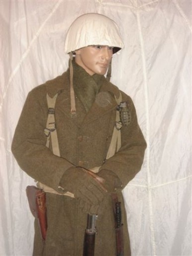 - Identique en tout point à la description ci dessus excepté qu'il a recouvert son casque d'un couvre casque blanc, fait "maison". Il n'était pas rare devant la pénurie et le mauvais approvisionnement que les troupes pour se camoufler viennent à prendre des draps blancs pour tailler couvres casques et chasubles. Par dessus ses vêtements pour se protéger au mieux il à mis la capote américaine. Ces mannequins ont été montés d'après photos d'époque, et sont vêtus de tenues représentatives. Mais il est possible de trouver des Hommes du 1er RCP à cette époque portant encore la tenue de saut en tant que tenue de combat, bien que légère et peu approprié aux conditions climatiques de ce rude hiver. Elles étaient généralement gardées en tenue de sortie ou de parade. On trouve aussi des photos les représentant habillés du blouson 41 seul, les bottes de saut sans Over Shoes ou encore les brodequins de montagne ou les Buckle. Boot's.